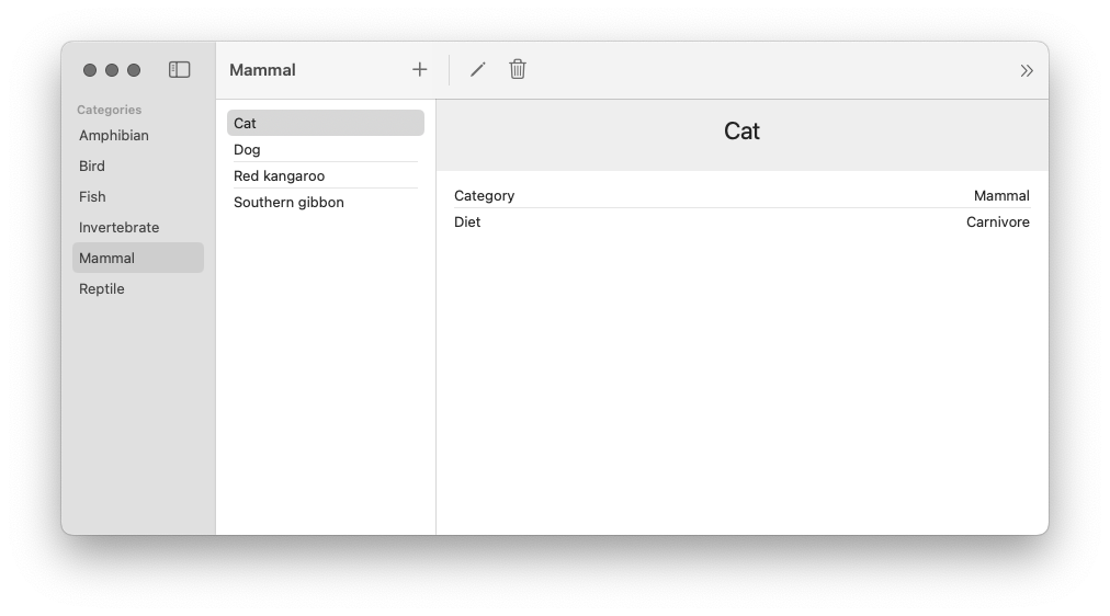 ImmutableDatainfra will deploy to any Apple platform that supports SwiftUI. To save ourselves some time, our sample application products will build SwiftUI optimized only for macOS. Learning how to build SwiftUI in a way that is optimized for multiple platforms is an important skill, but this is orthogonal to our goal of teaching a new way of thinking about state management and data flow. You are welcome to use our macOS sample application products as a starting point if you would like to build SwiftUI products that are also optimized for iOS, iPadOS, tvOS, visionOS, or watchOS. -