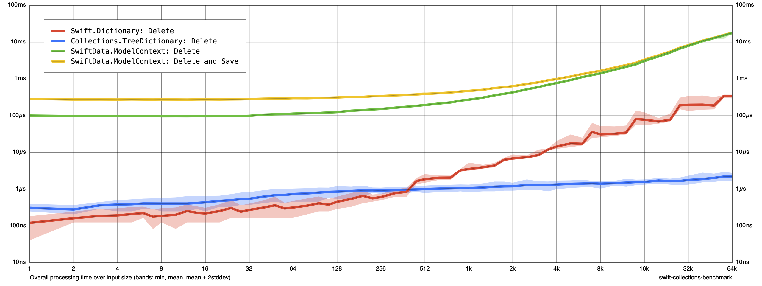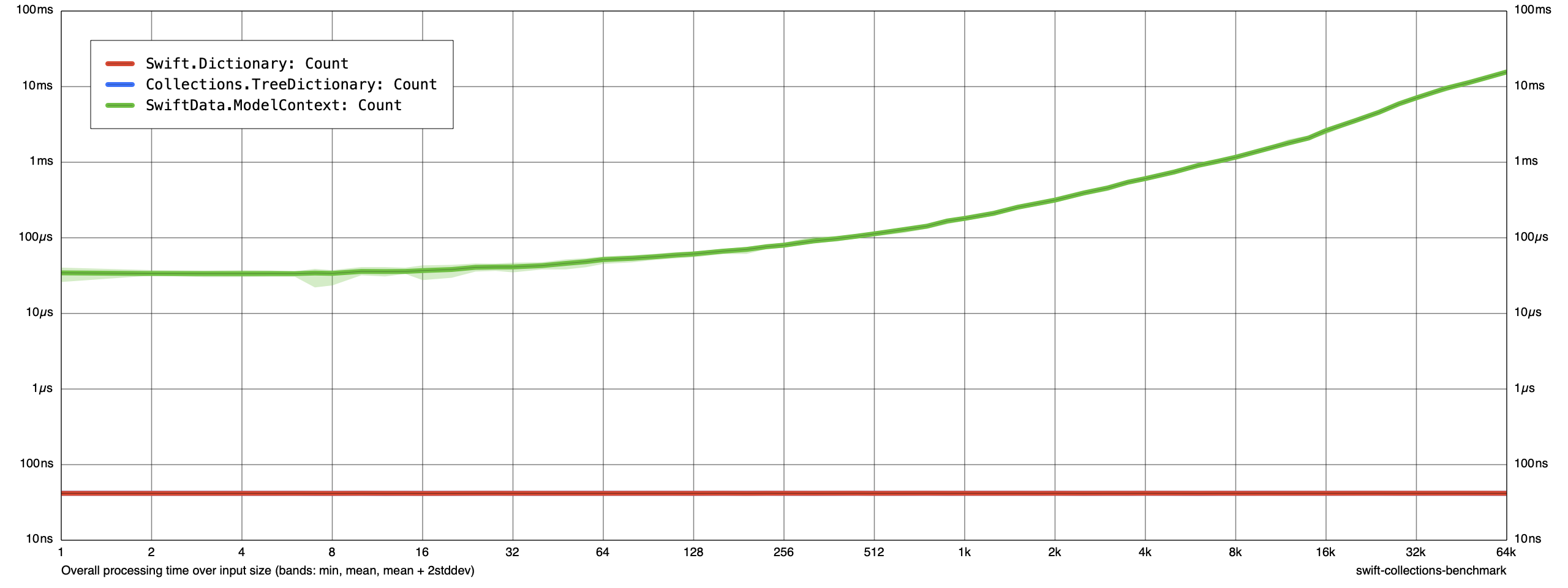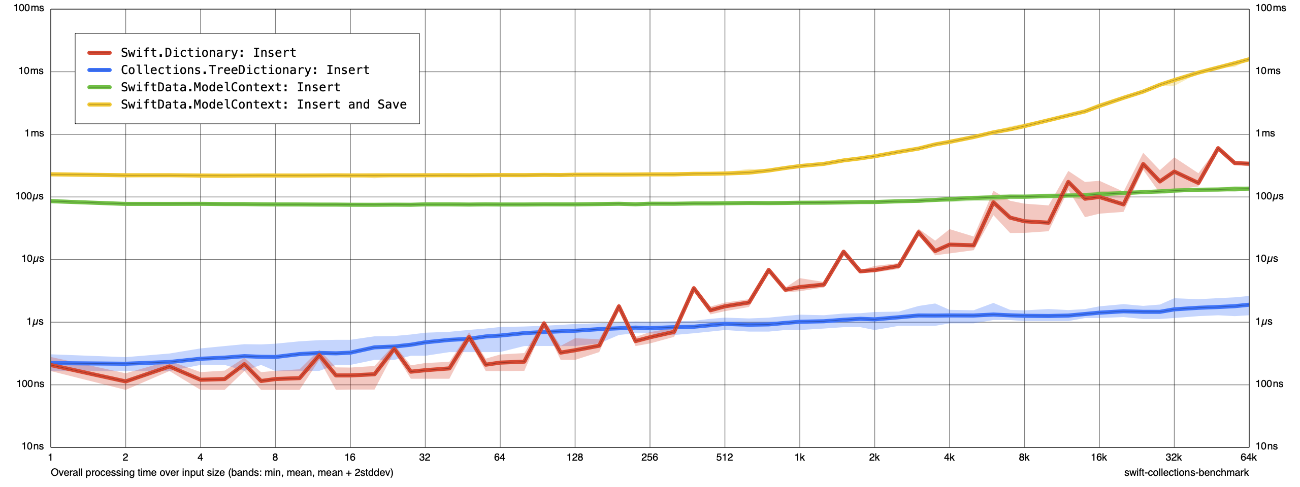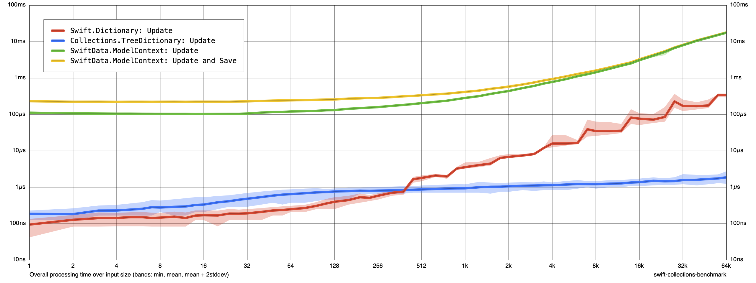 It’s difficult to make a strong judgement about memory usage of ModelContext when sorting compared to memory usage of ModelContext when inserting or updating. If you wanted to measure more closely, you could experiment with increasing the sample size to see if you can control for any noise in our measurements. What we’re most concerned about is that our immutable data structures — Dictionary and TreeDictionary — consume orders of magnitude less memory than ModelContext.